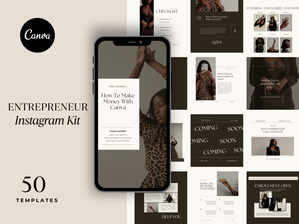 Impulsa tus redes sociales sin esfuerzo con este paquete seleccionado de más de 50 plantillas de Canva diseñadas exclusivamente para emprendedores.