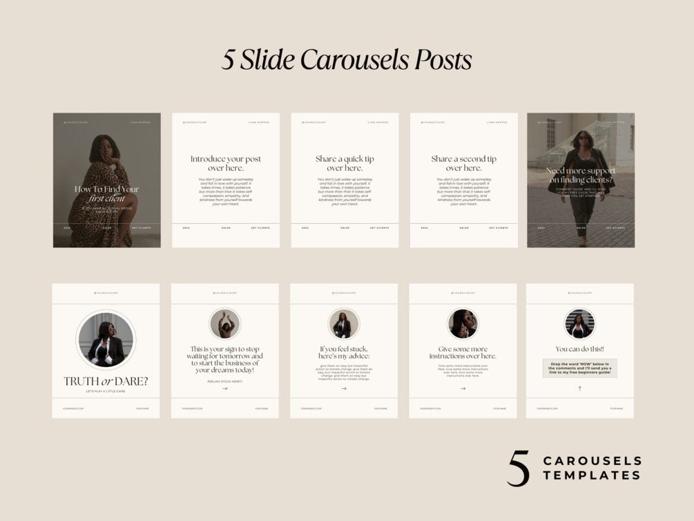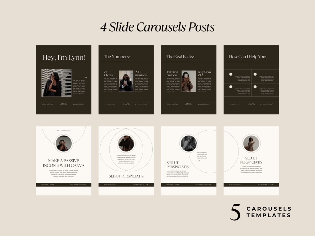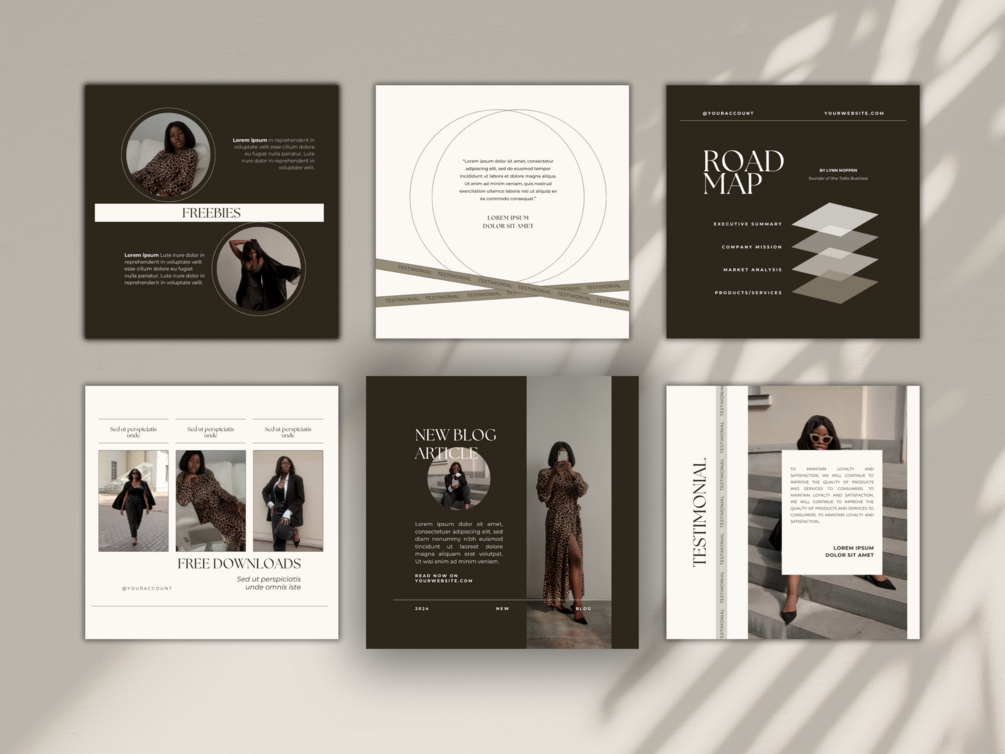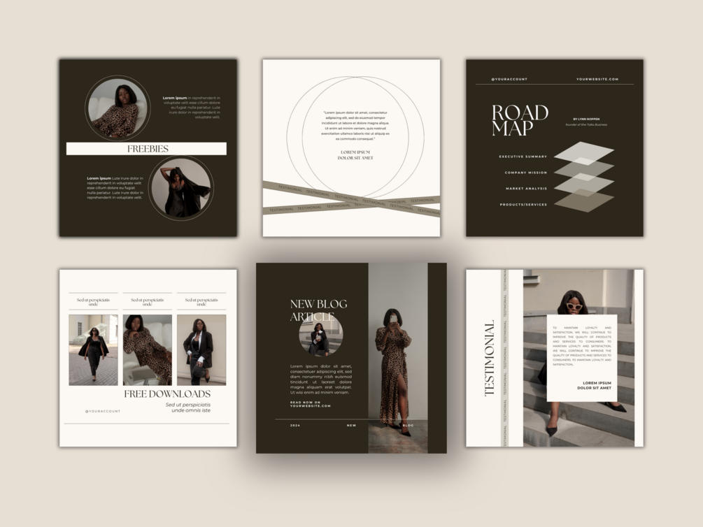 Diseñado para complementar tu estilo empresarial único, este paquete incluye una gama versátil de 50 plantillas, que incluyen gráficos cautivadores, publicaciones inspiradoras, citas que invitan a la reflexión, infografías y más, todo fácilmente personalizable en Canva.